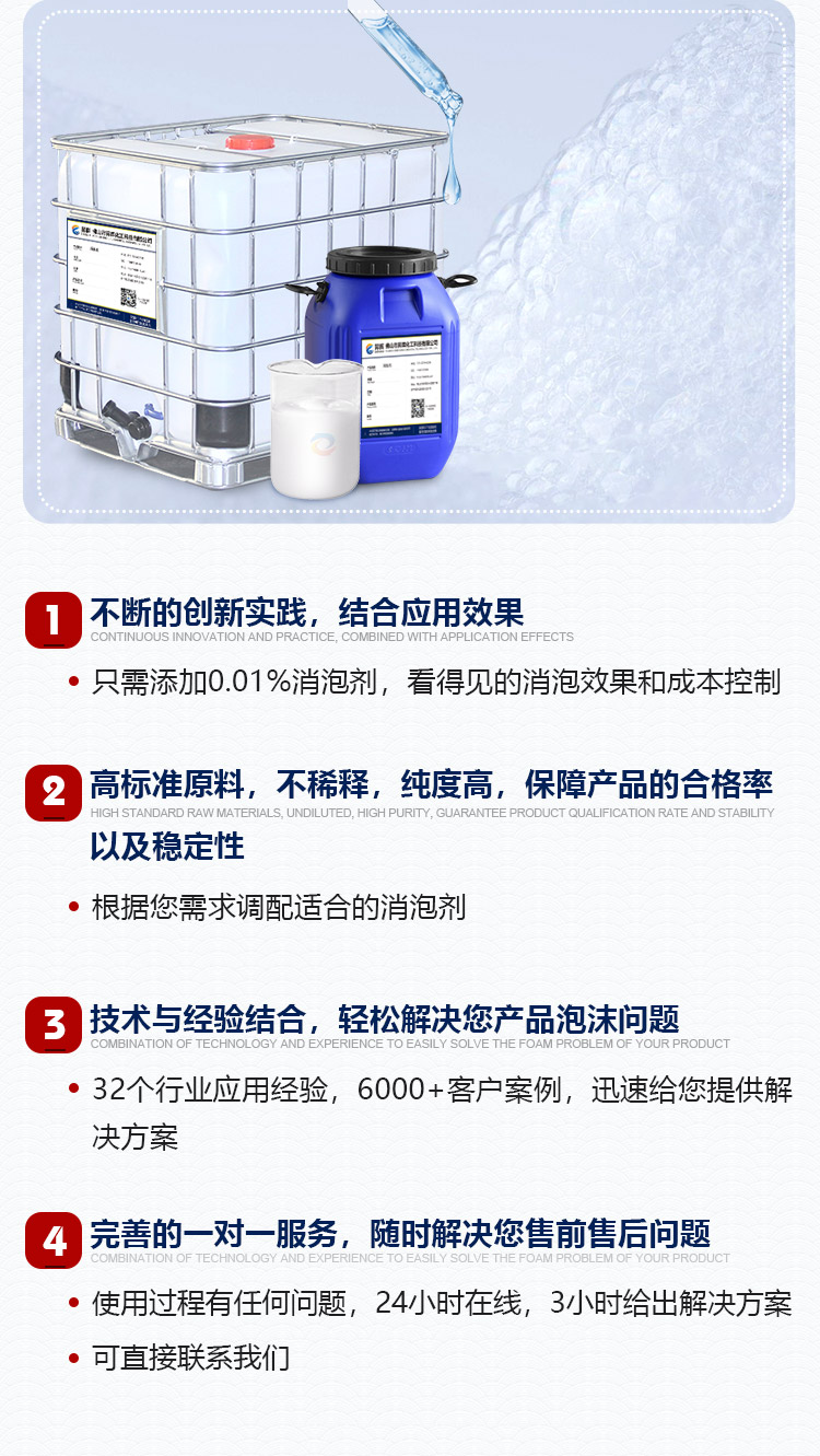 特點:高固含量、用量少、消泡快、抑泡長、水溶性好、可稀釋后用